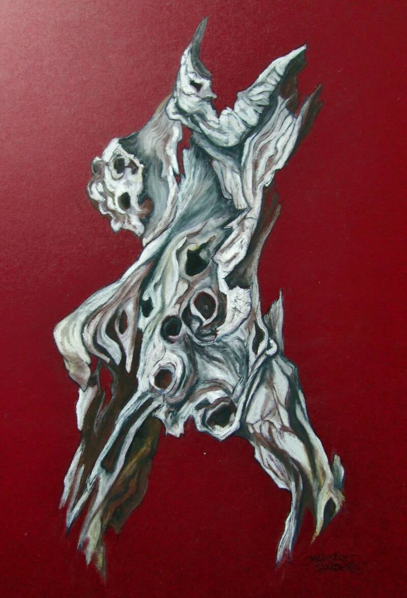 Like many artists I am fascinated by moss or lichen covered branches, tree bark and driftwood. The shapes, forms and textures for me become reflections of self, reminders of favourite objects, strange landforms or seascapes My imagination begins to flow and I just keep looking. Often it's not until I step away from my drawing that I see what it is becoming........